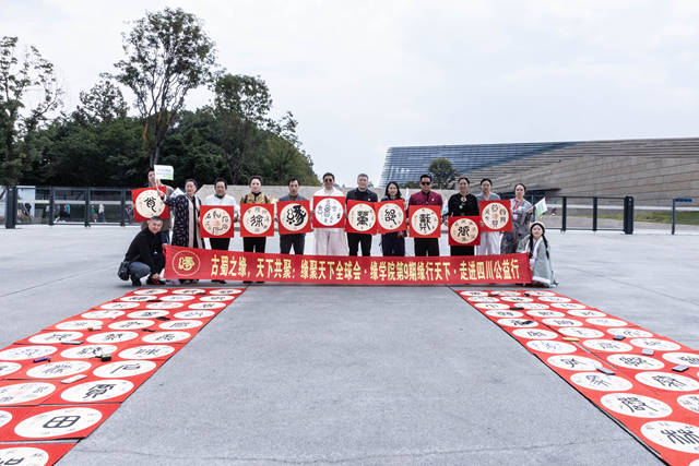 与此同时,考察团还在三星堆广场上举行了"中国古文字姓氏文化书法展公益行",吸引了一群前来研学的年轻学生。学生们围绕书法作品寻找自己的姓氏,踊跃与专家学者交流姓氏源流,与考察团成员合影留念。这场跨越时空的对话,让古老的文字成为连接不同代际的文化纽带,让久远的历史和当下的生命紧密相连。